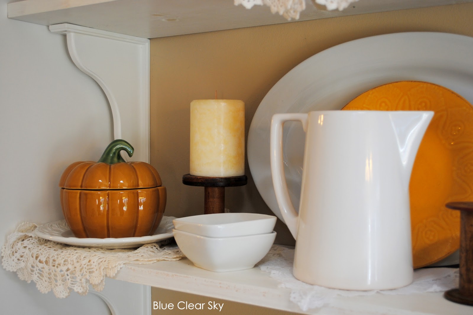 I love the blue and white accessories on the kitchen shelves for summer but it was time for a seasonal change. I decided on a white, brown and orange colour scheme.